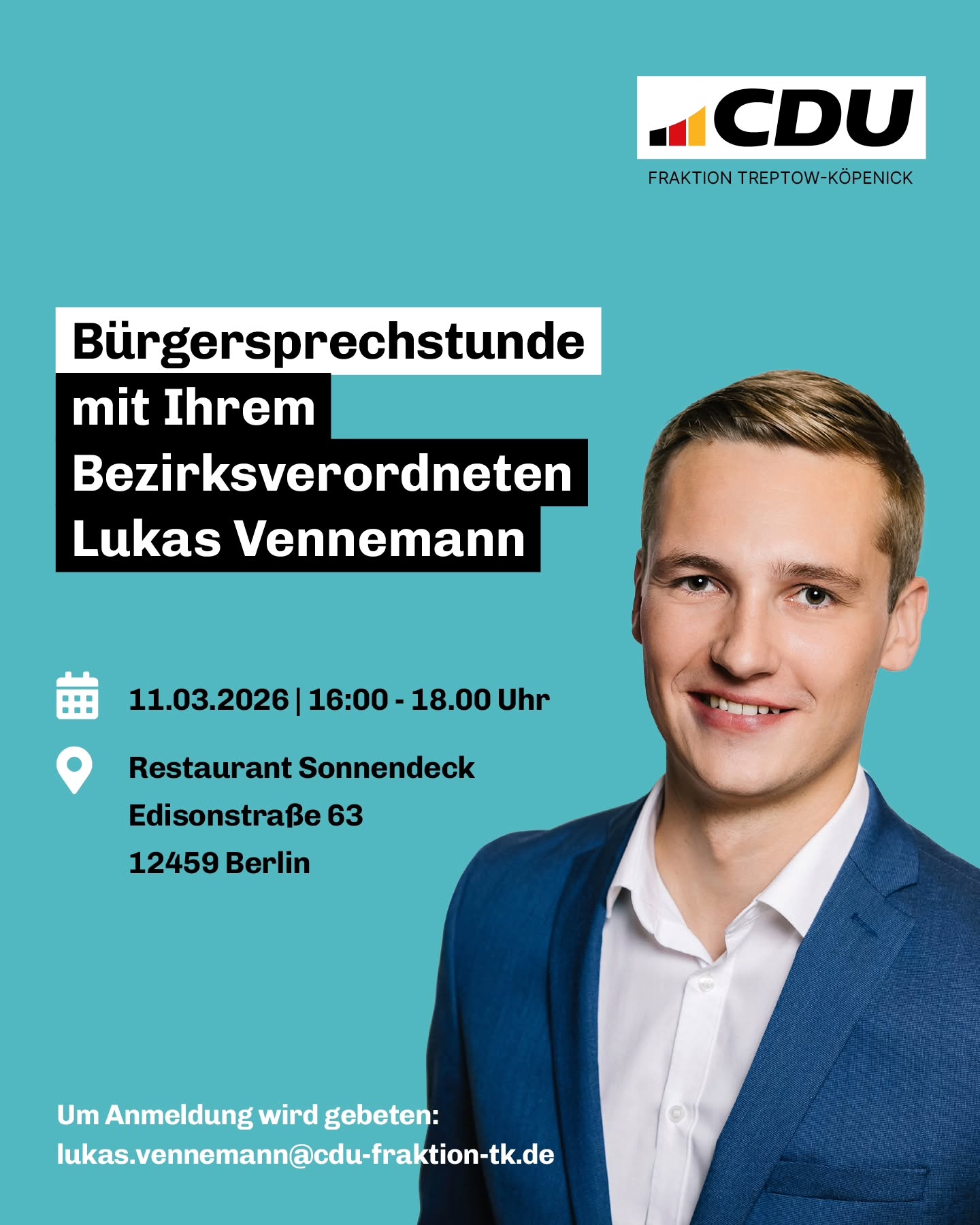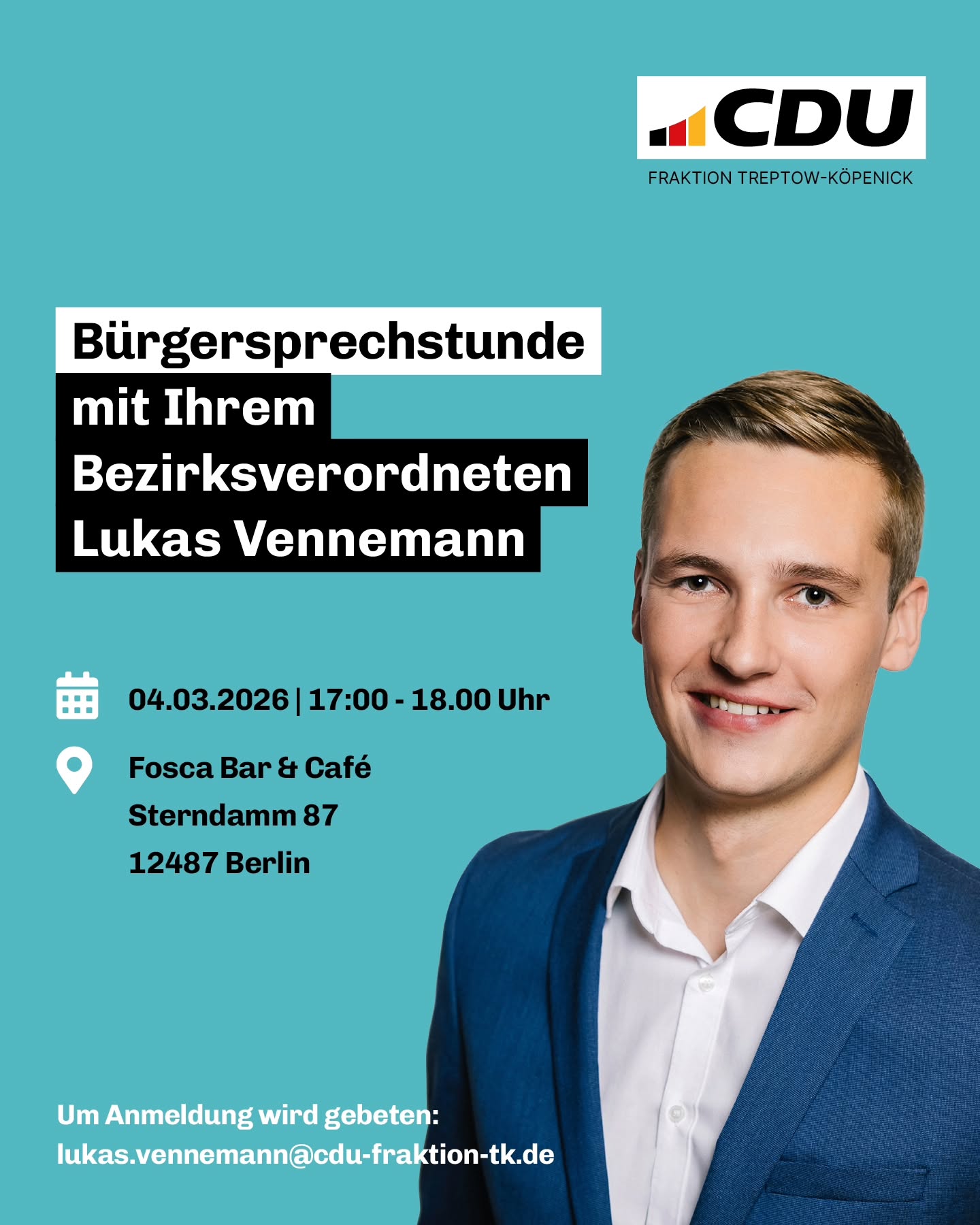 mehr🗣️ Herzliche Einladung zu meiner nächsten Bürgersprechstunde! Wenn ihr Fragen habt, ein Anliegen loswerden wollt oder Ideen für unseren Bezirk mitbringt, dann kommt gerne vorbei - ich freue mich auf den persönlichen Austausch mit euch! Denn eure Perspektiven und Impulse für Treptow-Köpenick sind mir wichtig.🙌 Falls ihr es zeitlich nicht schafft, schreibt mir einfach eine E-Mail ? ich melde mich zeitnah zurück: ✉️ lukas.vennemann@cdu-fraktion-tk.de #bürgersprechstunde #treptowköpenick #sportpolitik