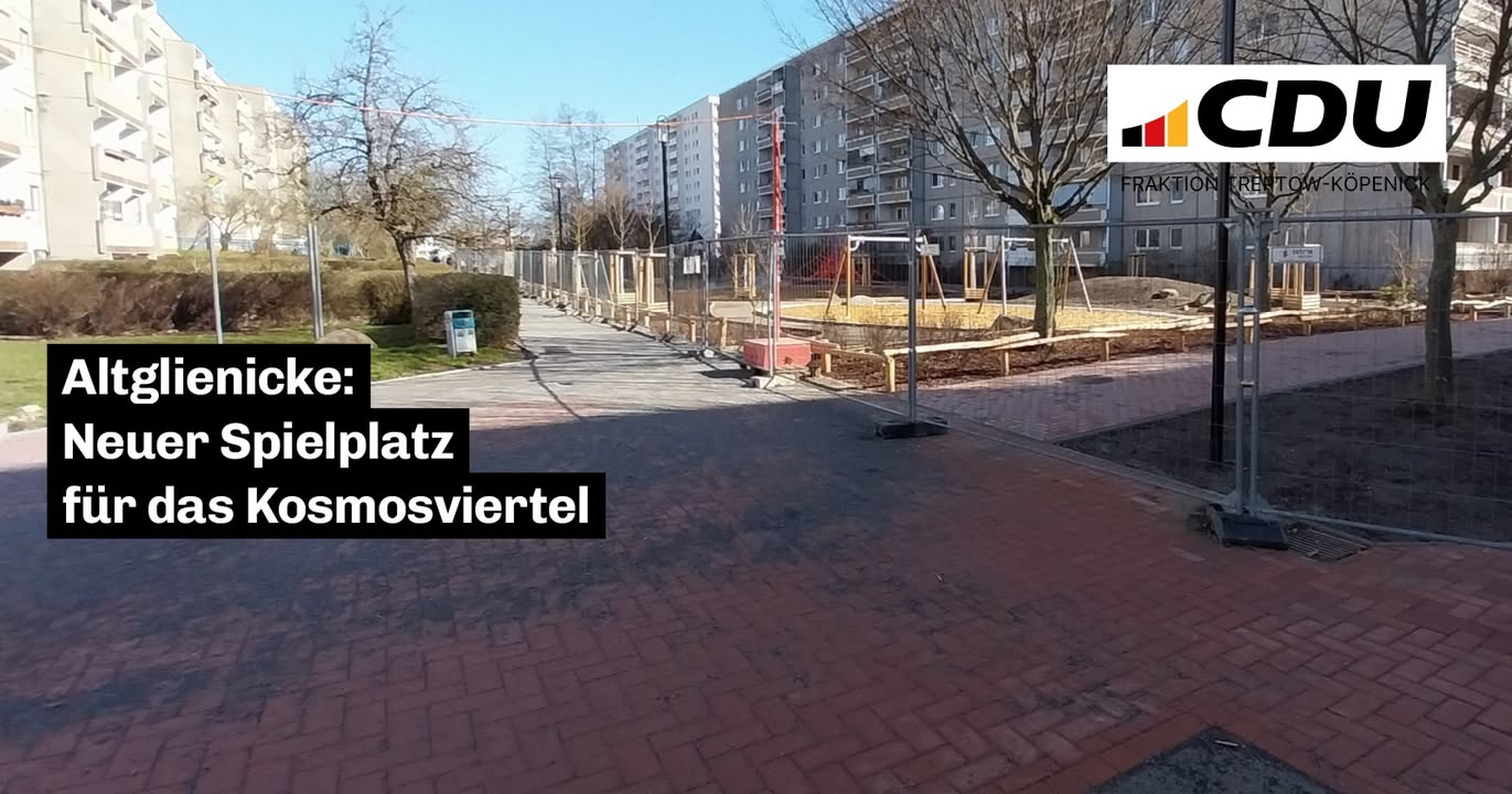 mehrIm Kosmosviertel Altglienicke geht es weiter voran:Die Bauarbeiten zur Umgestaltung des Traktorspielplatzes haben begonnen.Der Spielplatz ist Teil der Aufwertung des Grünzugs im Kosmosviertel, der seit 2022 entwickelt wird. Ziel ist es, das Quartier für Kinder, Familien und Anwohnende noch attraktiver zu gestalten.Geplant sind unter anderem:? ein naturnah gestalteter Spielpfad? neue Bäume für mehr Schatten? Nasch- und Blühsträucher? erneuerte Wege und ein neuer ZaunAuch der Grünzug selbst wird weiter aufgewertet ? unter anderem mit einem Wegeleitsystem, neuen Sitzbereichen und Graffitiwänden.Während der Bauzeit bleibt der Spielplatz voraussichtlich bis Sommer 2026 gesperrt. Der Wiesenspielplatz an der Siriusstraße kann weiterhin genutzt werden.Matthias Dehmel, Sprecher für Grünflächen der CDU-Fraktion:"Gute Nachrichten für das Kosmosviertel: Der neue Traktorspielplatz kommt. Mehr Grün, mehr Schatten und viel Raum zum Spielen sind ein echter Gewinn für Familien und den ganzen Kiez."Die feierliche Eröffnung des neugestalteten Grünzugs ist nach den Sommerferien geplant.Wer von Ihnen nutzt den Spielplatz im Kosmosviertel regelmäßig?
