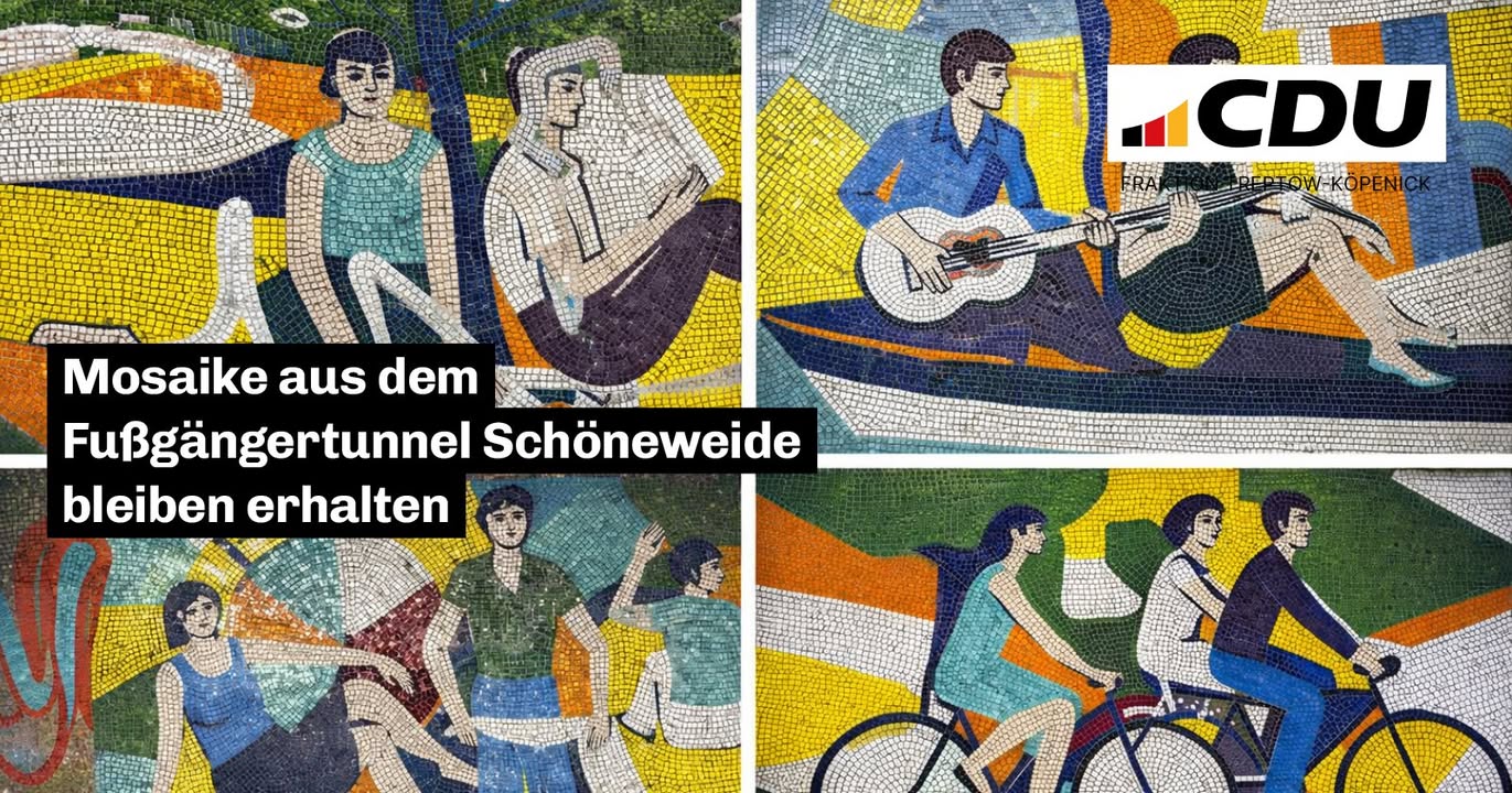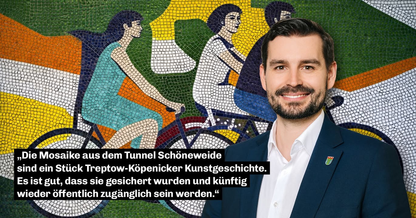 mehrBeim Rückbau des ehemaligen Fußgängertunnels am Bahnhof Schöneweide wurden vier Wandbildmosaike des Berliner Künstlers Klaus Roenspieß (1935?2021) gesichert.Die Mosaike zeigen Motive aus dem Freizeitleben und sind ein Stück Berliner Zeitgeschichte. Sie wurden von einer Fachrestauratorin abgenommen und werden derzeit für eine neue Verwendung vorbereitet.Geplant ist:? Ein Mosaik soll im neuen Fahrradparkhaus am Cajamarcaplatz integriert werden? Drei weitere Mosaike sollen später im historischen Bahnhofsgebäude Schöneweide ausgestellt werdenDamit bleiben die Kunstwerke aus dem Tunnel auch in Zukunft im Umfeld des Bahnhofs Schöneweide sichtbar.Die Sicherung der Mosaike zeigt:Auch bei großen Bauprojekten kann es gelingen, Kunst und Geschichte zu bewahren.